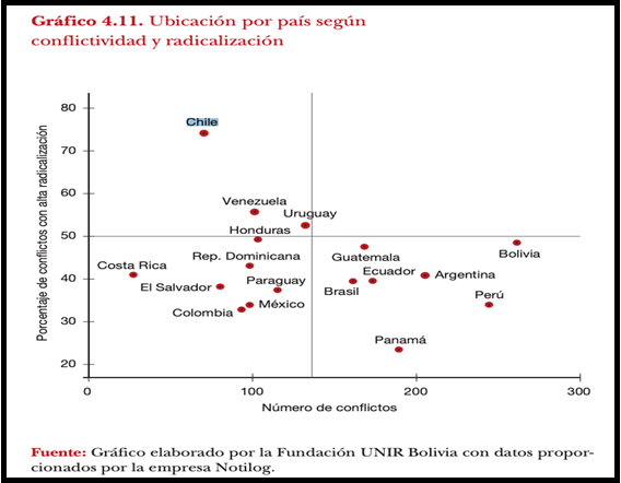 En este periodo Chile marca una excepción, como lo muestra esta gráfica: exhibe un bajo número de conflictos, aunque con altos grados de radicalización, al involucrar violencia y enfrentamientos.