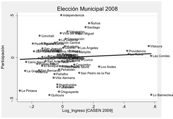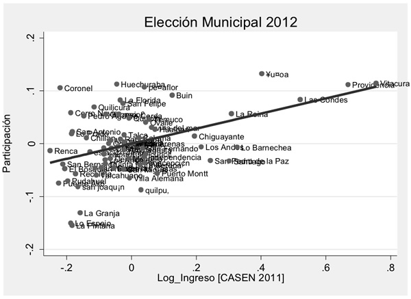 En la reciente elección municipal las tasas de participación electoral cayeron a niveles que ni los más pesimistas fueron capaces de predecir. Ante esta caída, recobra importancia la pregunta acerca de la distribución de la participación entre los distintos grupos socioeconómicos del país. Buscando una respuesta preliminar a nivel comunal, comparamos municipios similares pero con distintos niveles de ingreso promedio: comprobamos que hubo mayor participación en las comunas de mayores ingresos. Esta relación no se observa para la elección municipal del 2008, sino que emerge por primera vez junto a la reciente aplicación del voto voluntario.