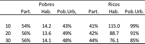Los datos anteriores son correctos, pero su interpretación es apresurada. Un análisis más cuidadoso de las cifras muestra que esta relación es sólo aparente: las comunas comparadas no sólo son distintas respecto a su ingreso promedio, sino que también en otras dimensiones muy relevantes que afectan fuertemente la participación: el tamaño de la comuna y cuán urbana es la misma. Para verlo, la Tabla 1 considera nuevamente las 10, 20 y 30 comunas más ricas y pobres según el ingreso individual promedio reportado en la última encuesta CASEN 2011, pero adicionalmente se muestra el tamaño promedio del padrón (habitantes, en miles de electores) en dichas comunas, y cuál es el porcentaje promedio de población urbana en ellas.