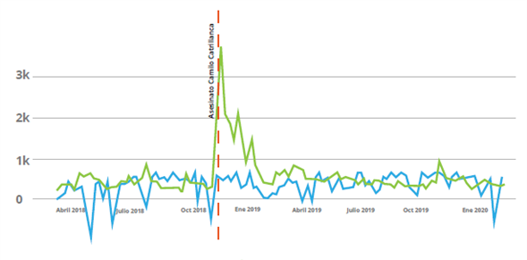 Un primer hallazgo es el volumen de tweets producidos en el período de estudio: es abundante y sobrepasa considerablemente, por ejemplo, la cantidad generada durante el último año de la ex presidenta Bachelet. Las menciones sobre la temática durante 2018 superan en 3,6 veces las de 2017; y 2 veces las del 2019. A pesar de la Operación Huracán y el Caso Antorcha -hitos del gobierno de Bachelet-, es en 2018 donde ocurre el hecho con mayor resonancia: el asesinato de Camilo Catrillanca. Este suceso concentra la mayor cantidad de menciones (55%); superando incluso el total de menciones de 2019 (30%).