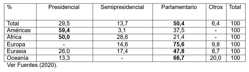 Desde el punto de vista de la distribución regional, en las Américas y África tienden a predominar los sistemas presidenciales, mientras en Europa, Eurasia y Oceanía los sistemas parlamentarios. Lo anterior se explica principalmente por los patrones de colonización y la adopción de regímenes políticos a partir de tales experiencias.