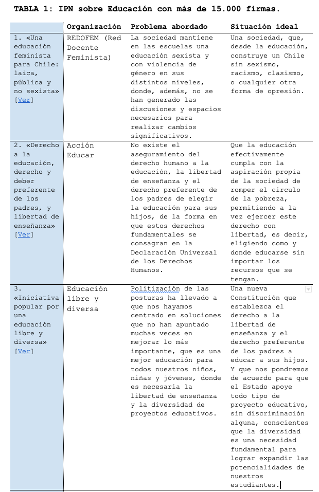 Mientras el proceso de participación estuvo abierto, la plataforma online de Iniciativa Popular de Norma (IPN) del proceso constituyente recibió 165 iniciativas referidas a educación, de las cuales 120 correspondían a propuestas de personas y 45 a organizaciones. En este artículo presentamos las 9 IPN que alcanzaron las quince mil firmas requeridas para su discusión y voto en la Convención Constitucional (CC). Las hemos analizado en base a los tres principios que consideramos clave: i)garantizar el derecho a la educación, con atención preferente del Estado hacia la educación pública; ii)establecer sentidos y propósitos del sistema educativo en su conjunto y condiciones para los privados que participen de él y; iii)libertad de enseñanza, entendida como el reconocimiento de proyectos educativos diversos —y no como libertad de empresa—, teniendo en consideración los principios del sistema educativo en su conjunto y la preeminencia del derecho a la educación de niños, niñas y adolescentes.