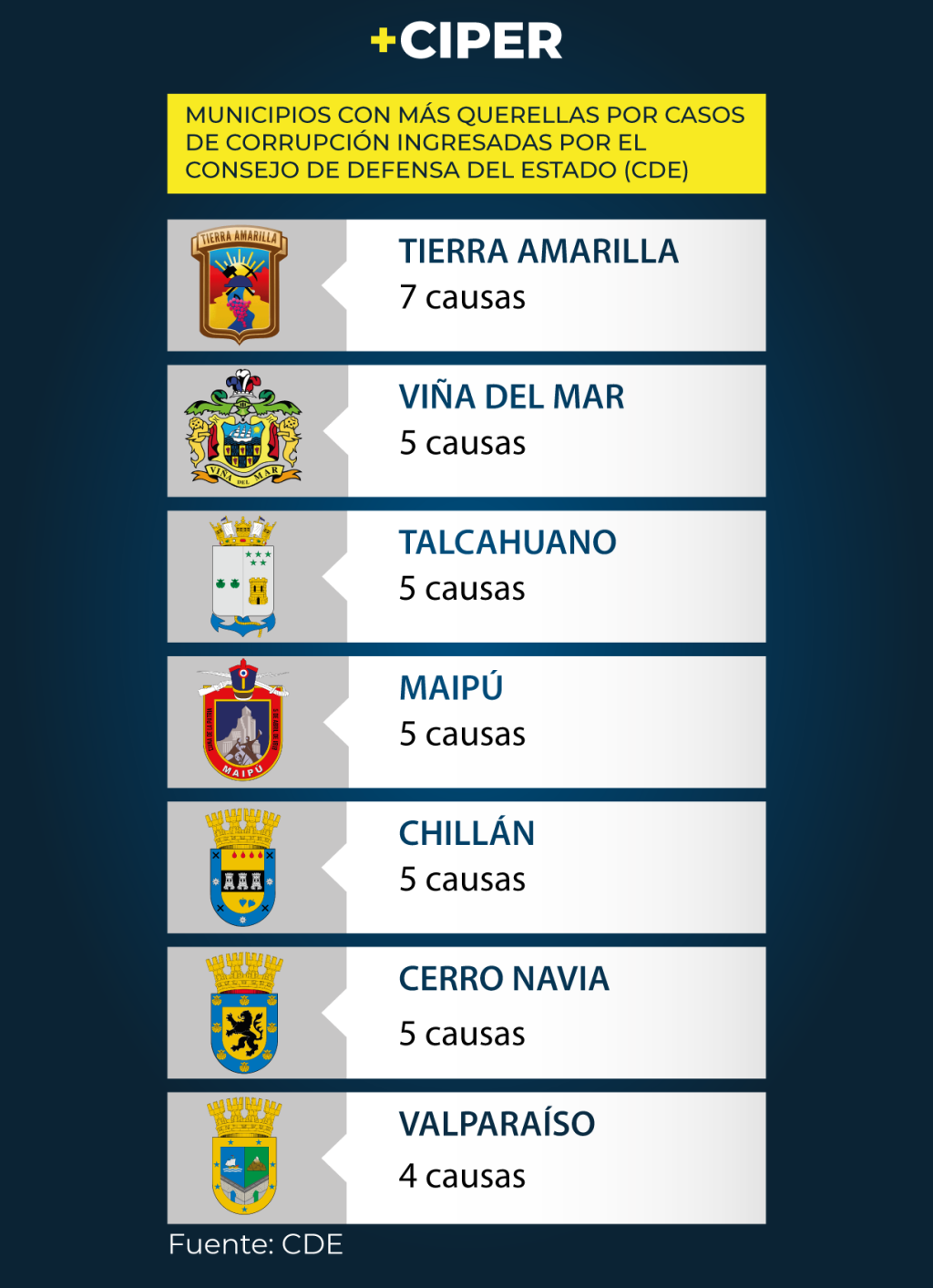 El Consejo de Defensa del Estado (CDE) ha presentado 203 querellas, desde 2009, por delitos de corrupción que involucran a municipalidades, corporaciones municipales, funcionarios y autoridades comunales. El registro -entregado por Ley de Transparencia-, indica que el CDE consideró que contaba con datos suficientes para presentar una acción judicial en 135 municipios, casi un 40% de las 346 comunas del país. De estos casos, 95 fueron cerrados o suspendidos, pero en el 58% de ellos no se determinaron culpables. La Municipalidad de Tierra Amarilla (Atacama) lidera el ranking con siete causas y dos exalcaldes investigados.