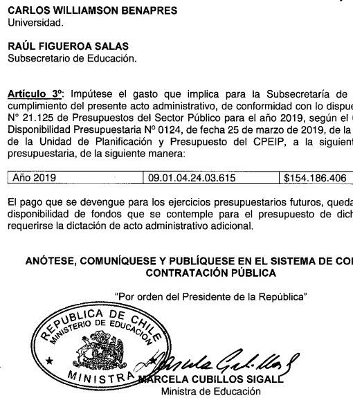 Si bien en el contrato aparecen como firmantes el propio Carlos Williamson y el exsubsecretario Raúl Figueroa, a diferencia de otros contratos firmados, en este también aparece la firma de la entonces ministra Marcela Cubillos y el timbre del Ministerio de Educación.