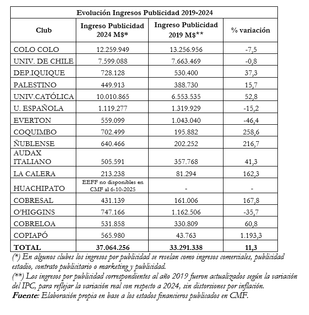 En contraste, clubes como Colo Colo (-7,5%), Universidad de Chile (-0,8%) experimentaron caídas, lo que podría deberse a un efecto de sustitución con respecto a otras fuentes de recursos publicitarios, ya que ambos clubes con el mayor nivel de convocatoria en el país lucen en sus poleras marcas de casas de apuestas. En la memoria anual del cuadro albo se indica que una de las casas de apuestas renovaron su vínculo con el club, y por segundo año consecutivo, se consolidó como uno de los principales auspiciadores manteniendo su alianza comercial a lo largo de toda la temporada. Por su parte el club laico, también en la memoria anual del año 2024 destaca el ingreso de un nuevo auspiciador, que se ha sumado a la institución, apoyando tanto el fútbol de varones como el femenino, cuyo acuerdo se mantendrá activo hasta finales de 2026, lo que permitió incrementar en un 52% los ingresos derivados del patrocinio principal.