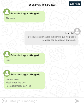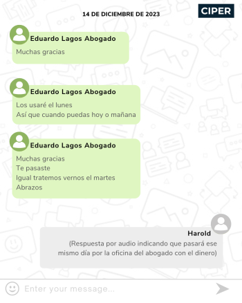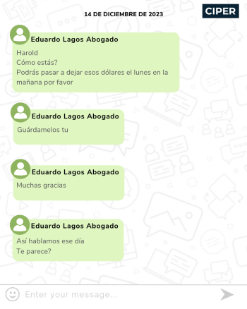 De esta manera, el Ministerio Público accedió a la conversación por WhatsApp entre Pizarro y Lagos fechada el 14 de diciembre de 2023. En ella, el abogado le preguntó a Pizarro si podía “pasar a dejar esos dólares el lunes [18 de diciembre] en la mañana”. Pizarro le contestó por nota de voz que tenía problemas para ese día, debido a un compromiso inamovible:
