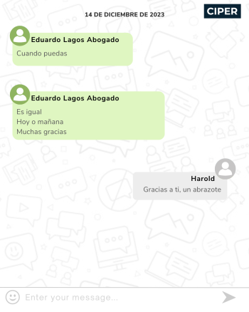 La revisión del teléfono de Harold Pizarro, además, permitió acceder a la conversación que sostuvo con la secretaria del estudio de Lagos pocas horas antes, quien le consultó si era posible ejecutar la operación transfiriendo el dinero a la cuenta bancaria de su hijo. Sin embargo, Pizarro advirtió que, debido al monto involucrado ($70 millones), lo conveniente era hacerlo a través de un cheque, tal como se hizo finalmente.