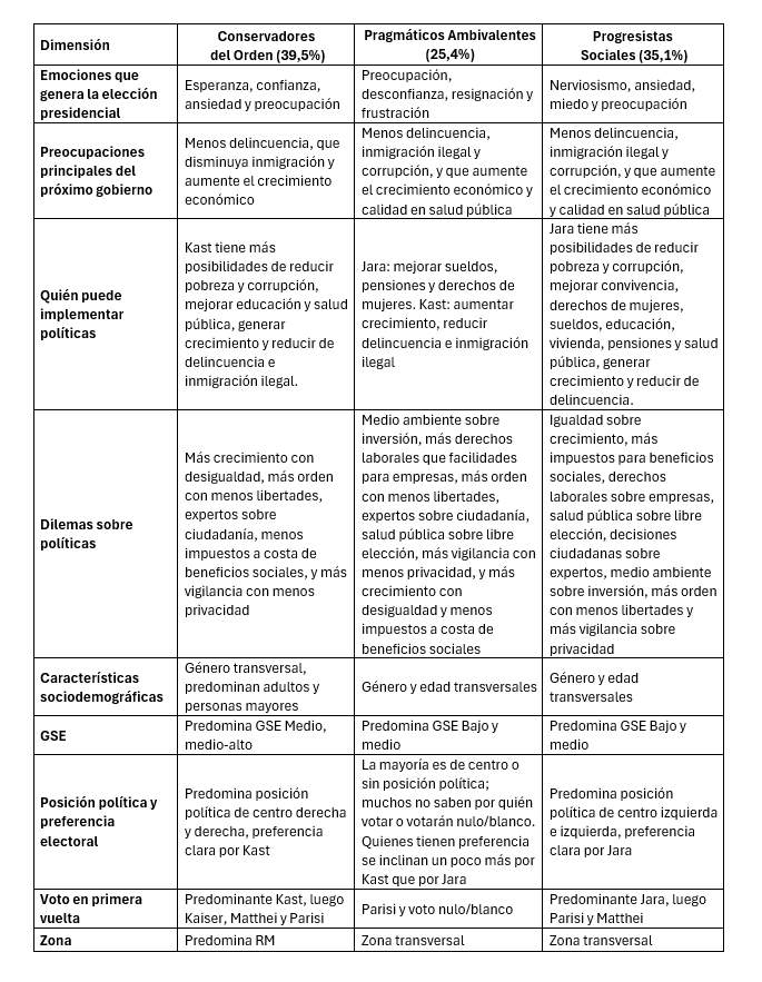 En términos sociodemográficos y socioeconómicos, este grupo está compuesto transversalmente por hombres y mujeres de todas las edades, con predominio de sectores socioeconómicos bajos y medios. La mayoría se ubica en el centro o no tiene posición política definida, y una porción significativa no sabe por quién votar o votará nulo/blanco. Quienes tienen preferencia se inclinan levemente más por Kast que por Jara. En la primera vuelta, votaron principalmente por Parisi o anularon/votaron en blanco. Por lo tanto, representan el voto flotante por excelencia: personas que no se sienten representadas plenamente por ningún sector, que combinan urgencias materiales inmediatas (seguridad, empleo) con valores progresistas (medio ambiente, derechos), y que enfrentan esta elección desde la incertidumbre y el escepticismo. Su voto puede inclinarse hacia cualquier lado, no por convicción ideológica sino por cálculo pragmático sobre quién podrá resolver mejor sus problemas concretos.