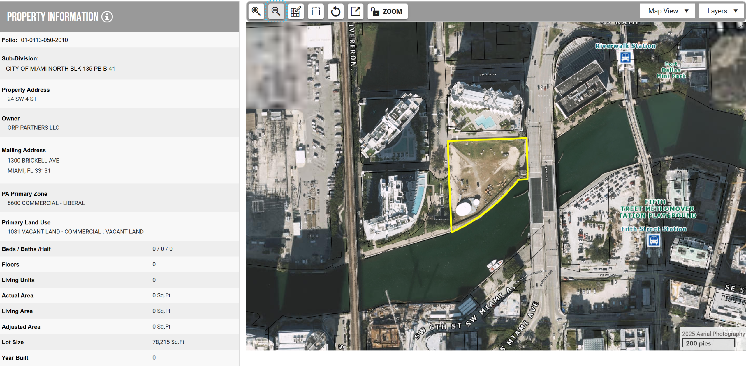 El terreno que mencionó Pesce, según el registro de propiedad de Miami, figura a nombre de ORP Partners LLC –la sociedad que crearon junto con Sartor para este proyecto—y es el siguiente: