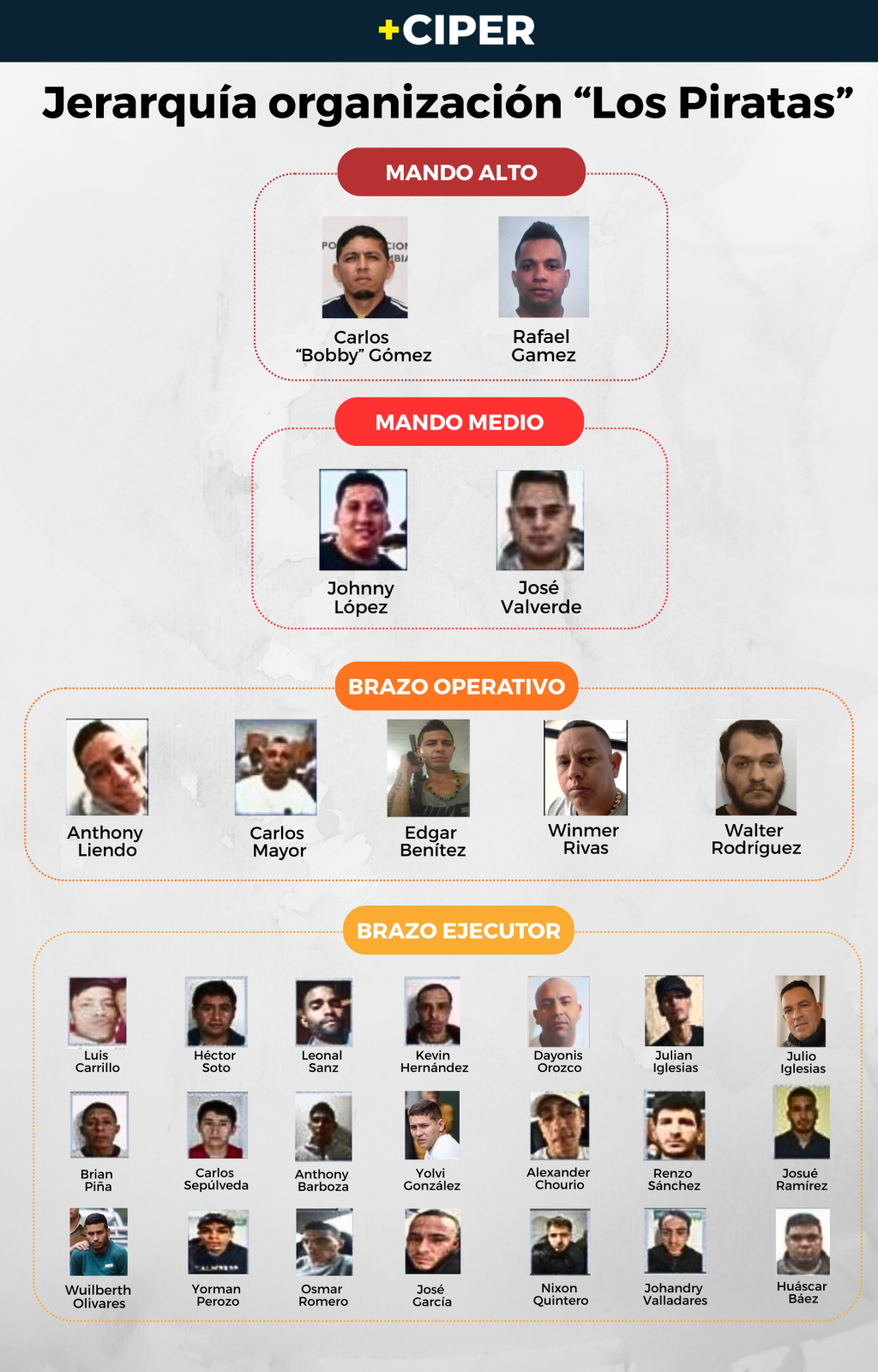 En la cúspide están los líderes radicados fuera de Chile, que deciden qué delitos cometer, quiénes participan, los cobros y castigos. Más abajo operan lugartenientes que dirigen las operaciones en el país. Les sigue el brazo operativo, encargado de coordinar y ejecutar los delitos. Y en la base está el brazo ejecutor, cuyos integrantes solo cumplen órdenes y ascienden según su desempeño. Entre los documentos revisados por CIPER, hay antecedentes sobre los principales miembros de “Los Piratas”: