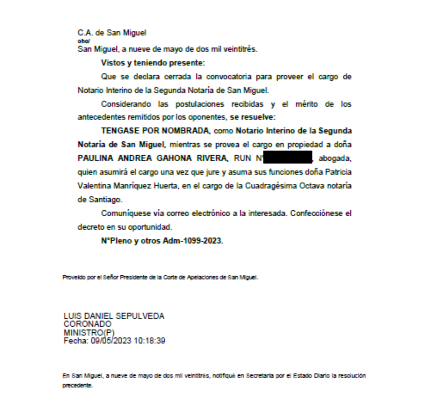 Según la normativa vigente, son los presidentes de las cortes de apelaciones respectivas quienes tienen la facultad para nombrar a los notarios interinos. Y en este caso, fue por decisión de Sepúlveda que Paulina Gahona asumió como notaria interina de la 2da Notaría de San Miguel en mayo de 2023, donde luego fue contratado el sobrino del ministro para ejercer como oficial primero.