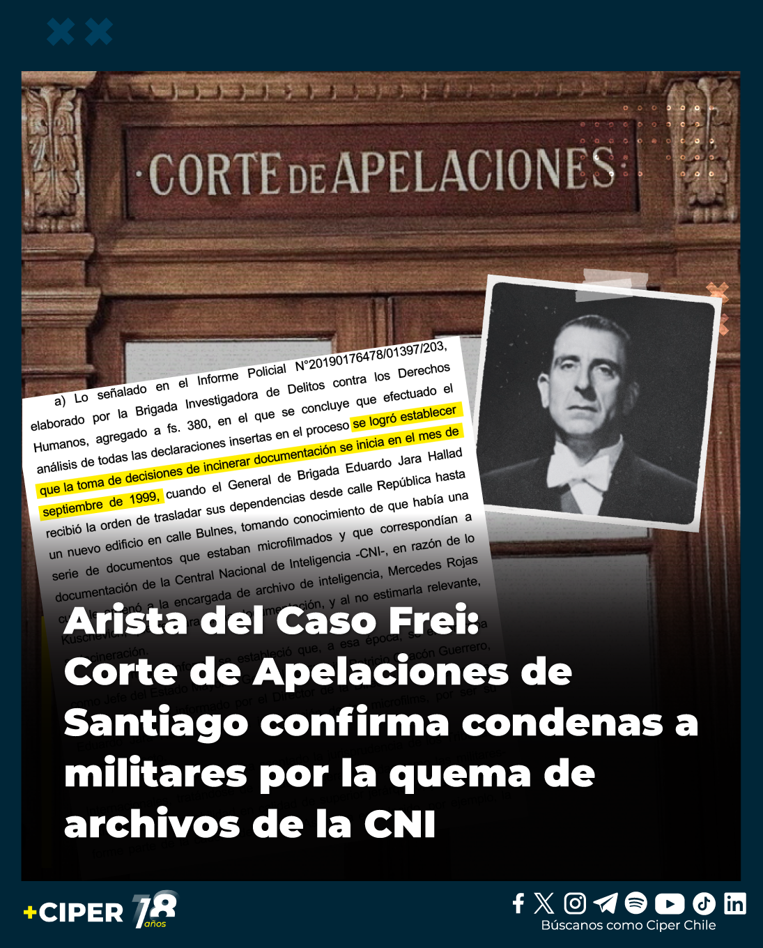 El tribunal de alzada de Santiago ratificó la condena de tres miembros en retiro del Ejército, por su responsabilidad en la quema de archivos de la CNI de los años 1980 a 1982. La destrucción ocurrió entre 2000 y 2001, cuando se desarrollaron las mesas de diálogo, uno de los esfuerzos para obtener información sobre violaciones a los Derechos Humanos en dictadura.