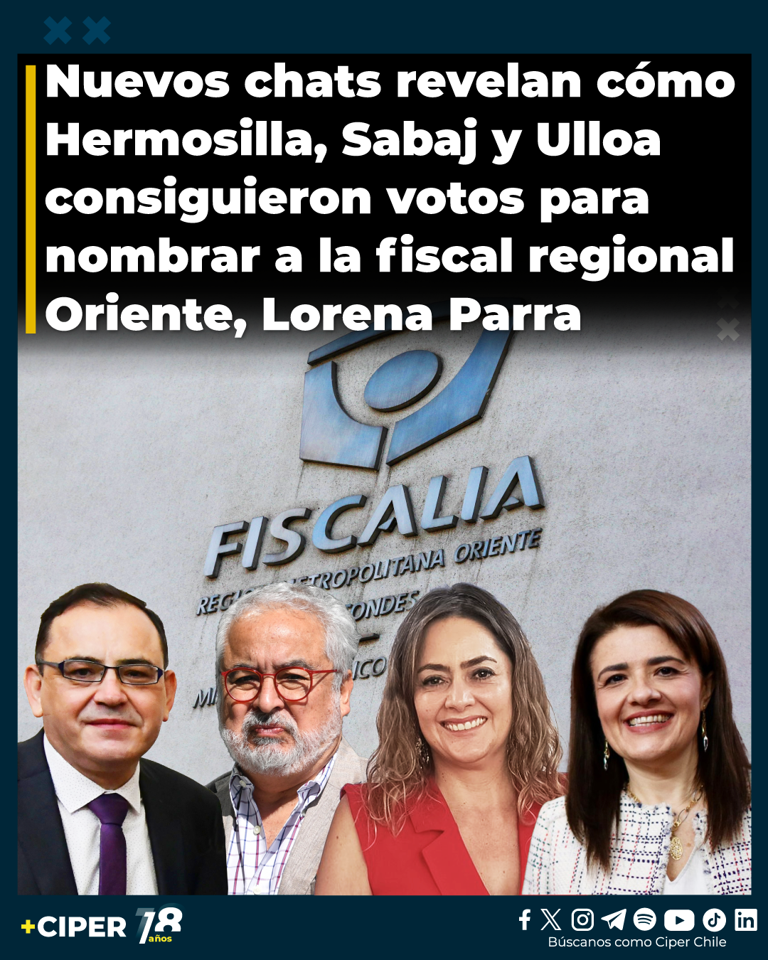CIPER tuvo acceso a nuevos chats entre la exjueza Verónica Sabaj y Luis Hermosilla. Hasta ahora, en los mensajes entre ambos había surgido evidencia de que ella le entregó información reservada al penalista y que le sugirió estrategias procesales para una causa que afectaba al presidente Piñera. Pero, la nueva revisión de CIPER detectó mensajes en los que Sabaj y Hermosilla se unieron para operar a favor de la nominación de Lorena Parra a la cabeza de la Fiscalía Oriente. Hoy la misma fiscal Parra tiene a su cargo la indagatoria en la que Hermosilla fue formalizado y pasó 200 días en prisión preventiva. El penalista y Sabaj convencieron al juez Ulloa de apoyar a Parra.