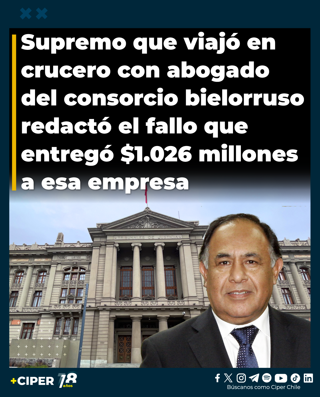 En marzo de 2024 la Corte Suprema publicó el fallo que obligó a Codelco a pagar más de $1.026 millones al consorcio de origen bielorruso CBM. Esa resolución, que fue parte de la disputa legal del consorcio con Codelco, fue redactado por el ministro Diego Simpertigue, quien hoy está bajo la lupa por haberse embarcado en un crucero de lujo junto a uno de los abogados de CBM apenas dos días después de que finalizara el enfrentamiento judicial entre el consorcio y la cuprífera. Esta mañana, la Corte Suprema decretó la apertura de un sumario para investigar a Simpertigue.