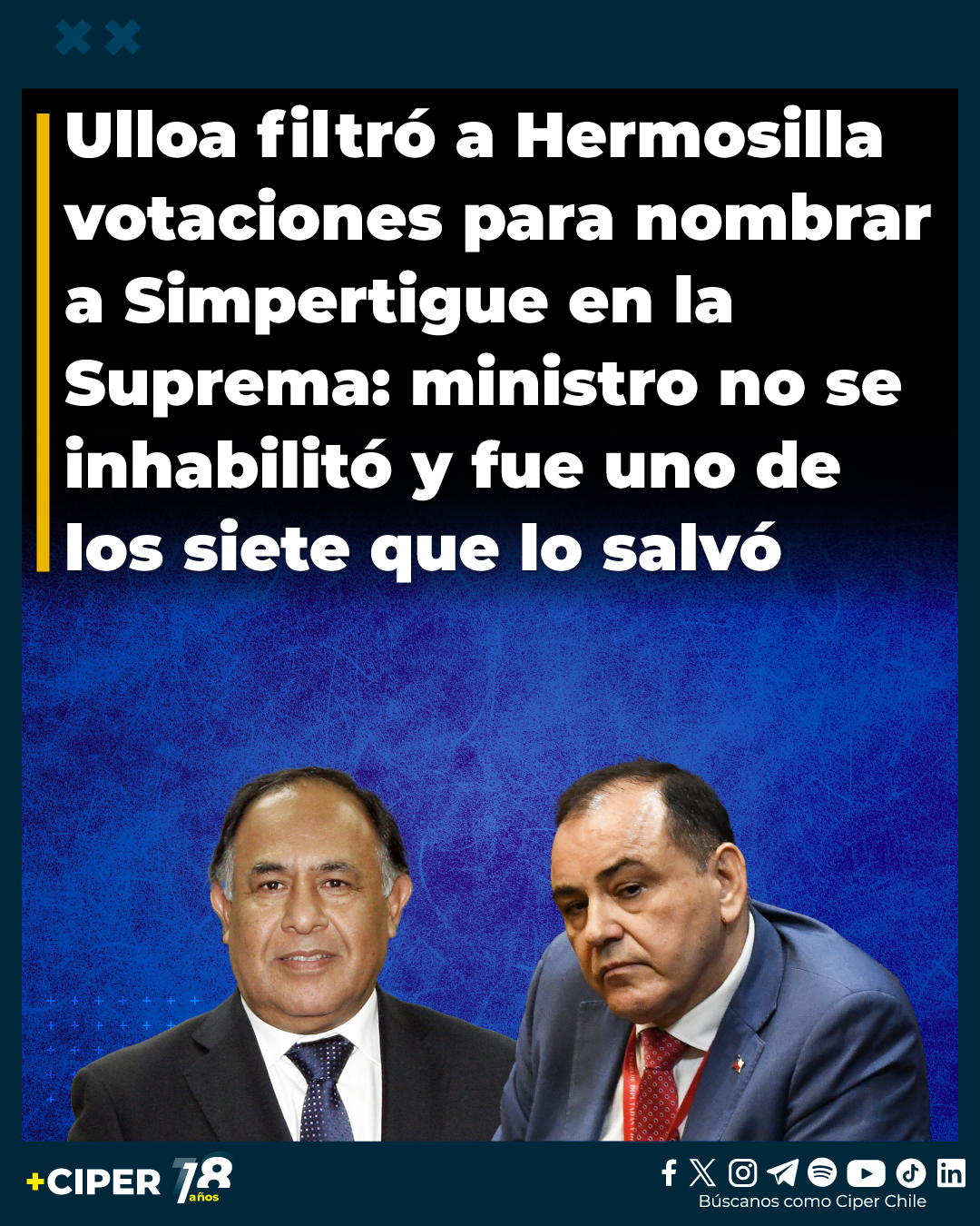 Durante el segundo gobierno de Sebastián Piñera, el recién destituido exministro Antonio Ulloa envió en dos ocasiones a Luis Hermosilla las actas con los candidatos votados por los supremos para integrar el máximo tribunal del país. En esos dos listados se repite el nombre de Diego Simpertigue, amigo de Ulloa, quien logró su cometido de ingresar a la corte en el segundo intento, aunque en la votación de los supremos nunca obtuvo la primera mayoría. Los antecedentes fueron parte de la investigación sumaria en contra de Ulloa, y la fiscal judicial decidió que eran actos que debían ser sancionados. A pesar de esto, Simpertigue no se inhabilitó durante el proceso de remoción de Ulloa y fue uno de los siete ministros que decidieron mantenerlo en su cargo. Este lunes, el Senado aprobó la acusación constitucional en contra de Ulloa, definiendo su salida del Poder Judicial.
